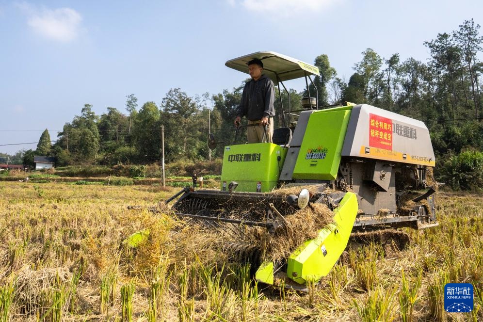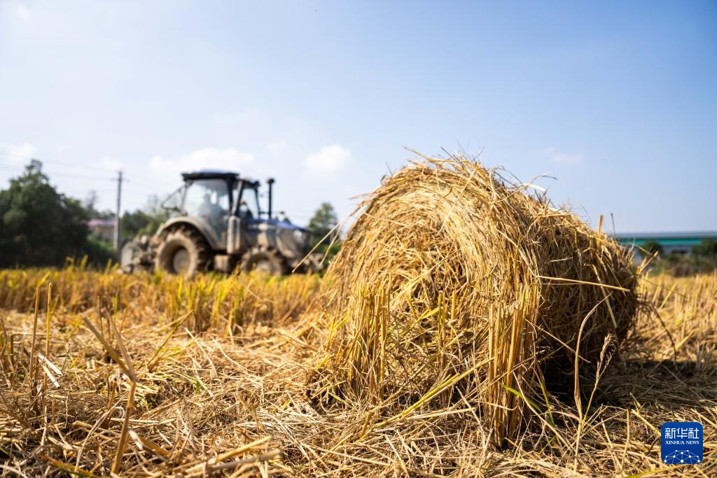 11月5日,在长沙县开慧镇开慧村,乡民操作自走式秸秆打捆机收回水稻秸秆。