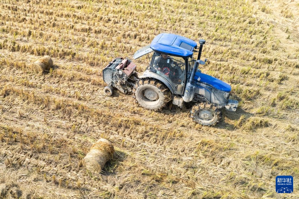 11月5日,在长沙县开慧镇开慧村,乡民操作牵引式秸秆打捆机收回水稻秸秆(无人机相片)。