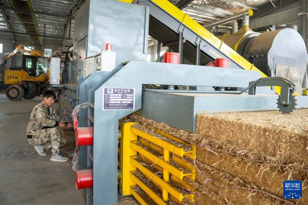 11月5日,在坐落长沙县开慧镇的长沙萱凡农业发展有限公司秸秆饲料化加工车间,工人操作秸秆打包机。